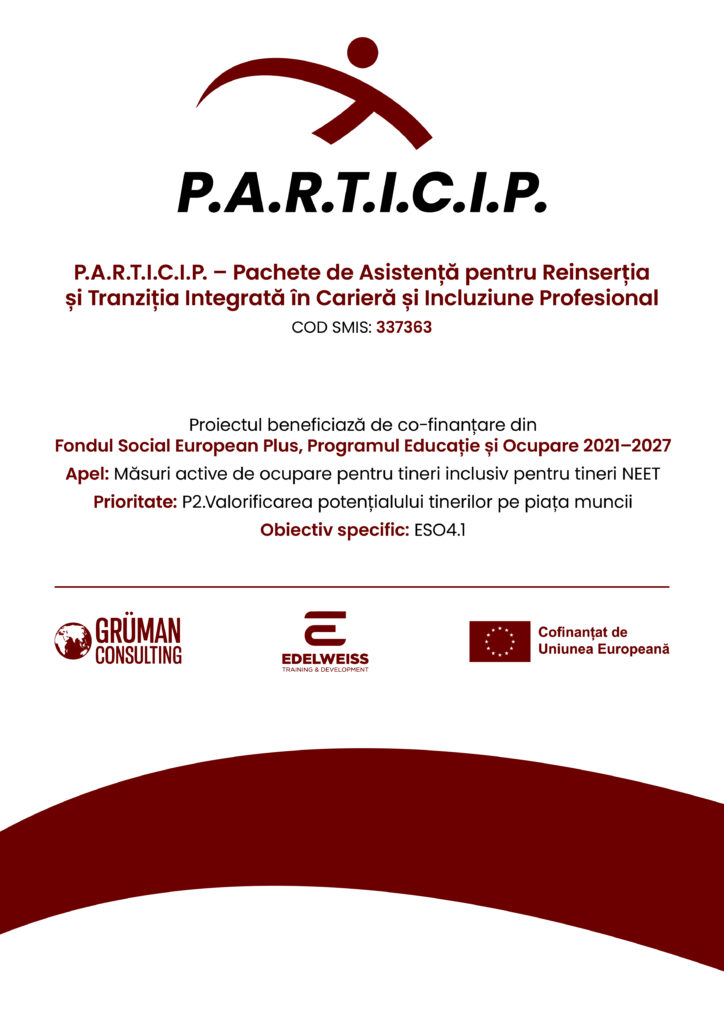 GRÜMAN CONSULTING S.R.L. în parteneriat cu EDELWEISS TRAINING & DEVELOPMENT S.R.L. – Partener implementează în perioada iunie 2025 – mai 2027 proiectul cu titlul ” P.A.R.T.I.C.I.P. – Pachete de Asistență pentru Reinserția și Tranziția Integrată în Carieră și Incluziune Profesională”, cod SMIS 337363.